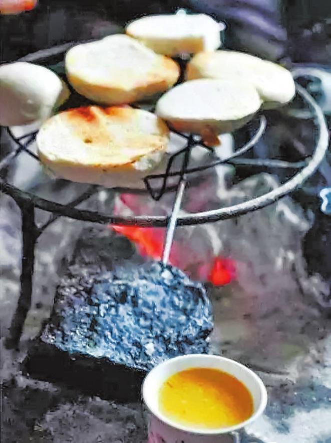 喝茶时,主人会先把包谷面馍切成匀称的片片,一一煨在火塘周围让火烤,然后往黑陶罐内放入茶叶,煨在火边烤,等烤出了香气,倒出茶叶,再往罐里注入水,把茶与盐、生姜和提前炒好的油面,一起搁入罐中熬煮,同时也用一根小棍在其中翻搅,使茶叶与茶料均匀融和。茶汤煮好后,倒进瓷杯,茶香、油香、盐姜的鲜香滋润,香气四溢。这时包谷面馍片片烤得焦黄,脆酥可口,谷香荡漾,主人先吃上一片糯香的馍片,然后举而饮之,那种气氛与环境,至今思之,犹向往矣。当地人把此茶也叫油茶。有时主人在煮茶时,会在火烬中放几颗核桃烧烤,经过烧烤的核桃油香充盈,作下茶点心,更增美味。