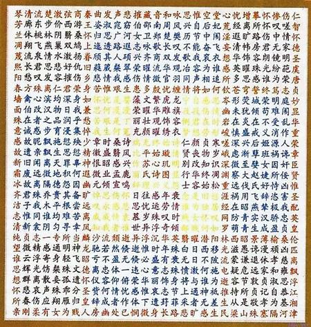 《璇玑图》用五彩丝织成,横竖各29字,锦方八寸,顺读、回读、横读、斜读、交互读、蛇行读、退一字读、重一字读、间一句读、左右旋读,皆成诗章。结构不同,但主题不离闺怨。从中能婉转读出数百乃至几千首诗,真是奇妙至极。再引用武则天的话来说,它“五采相宣,莹心耀目”“题诗二百余首”,共计八百余字。纵横反复,皆成章句。其文点画无缺,才情之妙,超古迈今,名《璇玑图》。图刚织出,一般人看了,都读不懂。苏蕙笑对人说:“徘徊宛转,自成文章。非我佳(家)人(指窦滔),莫之能解。”于是让家仆将《璇玑图》送到襄阳。窦滔看了,果然感慨其写得无比绝妙,立即回心转意,备上车辆厚礼,接苏蕙到汉南任所,二人“恩好愈重”。武则天所作《苏氏织锦回文记》还提到,苏蕙前后著文词五千余字,遭隋末丧乱,文字散落,寻求不获。“而锦字回文,盛见传写。”它是闺怨诗的范文,最早的传世回文诗。(李昉等编《文苑英华》卷834)评价极高,赞不绝口。难怪后人将苏蕙与蔡文姬、谢道韫、左棻并列,为魏晋十六国四大才女之一。